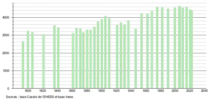 L'évolution du nombre d'habitants est connue à travers les recensements de la population effectués dans la commune depuis 1793. Pour les communes de moins de 10 000 habitants, une enquête de recensement portant sur toute la population est réalisée tous les cinq ans, les populations de référence des années intermédiaires étant quant à elles estimées par interpolation ou extrapolation[30]. Pour la commune, le premier recensement exhaustif entrant dans le cadre du nouveau dispositif a été réalisé en 2005[31].