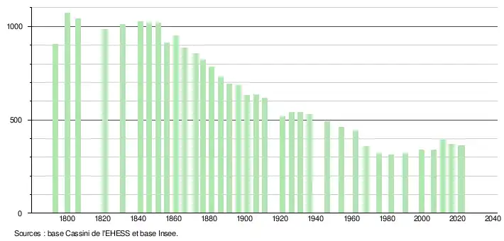 L'évolution du nombre d'habitants est connue à travers les recensements de la population effectués dans la commune depuis 1793. Pour les communes de moins de 10 000 habitants, une enquête de recensement portant sur toute la population est réalisée tous les cinq ans, les populations de référence des années intermédiaires étant quant à elles estimées par interpolation ou extrapolation[25]. Pour la commune, le premier recensement exhaustif entrant dans le cadre du nouveau dispositif a été réalisé en 2006[26].
