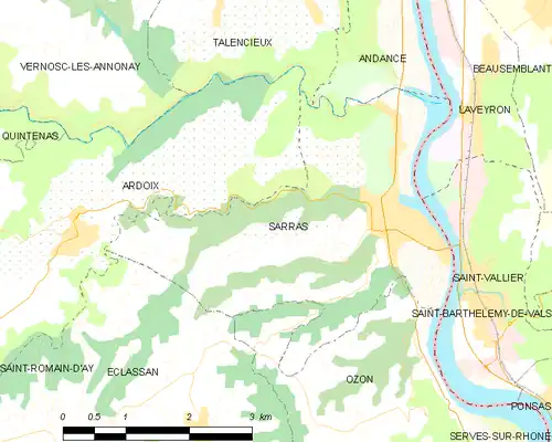 Sarras est limitrophe de sept communes[2], dont cinq sont situées dans le département de l'Ardèche et deux dans le département de la Drôme. Elles sont réparties géographiquement de la manière suivante :
