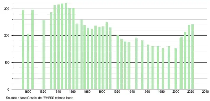 L'évolution du nombre d'habitants est connue à travers les recensements de la population effectués dans la commune depuis 1793. Pour les communes de moins de 10 000 habitants, une enquête de recensement portant sur toute la population est réalisée tous les cinq ans, les populations de référence des années intermédiaires étant quant à elles estimées par interpolation ou extrapolation[20]. Pour la commune, le premier recensement exhaustif entrant dans le cadre du nouveau dispositif a été réalisé en 2007[21].