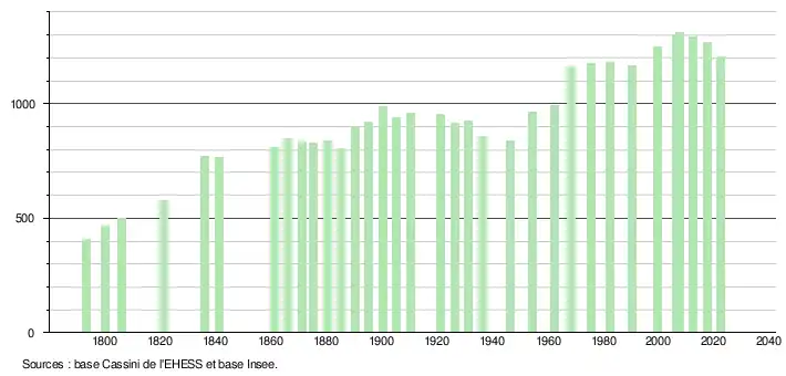 L'évolution du nombre d'habitants est connue à travers les recensements de la population effectués dans la commune depuis 1793. Pour les communes de moins de 10 000 habitants, une enquête de recensement portant sur toute la population est réalisée tous les cinq ans, les populations de référence des années intermédiaires étant quant à elles estimées par interpolation ou extrapolation[20]. Pour la commune, le premier recensement exhaustif entrant dans le cadre du nouveau dispositif a été réalisé en 2007[21].