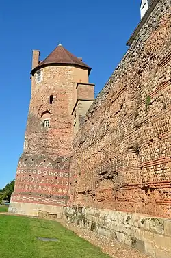 Plusieurs vestiges de la période gallo-romaine ont été mis au jour en Sarthe. L'enceinte romaine du Mans a été édifiée à la fin du IIIe siècle pour résister aux invasions barbares. Elle forme un quadrilatère irrégulier de 450 m de long sur 200 m de large[34]. Sur la commune d'Aubigné-Racan, dans le sud du département, le site archéologique de Cherré regroupe un théâtre, un forum, un temple, des thermes ainsi qu'un aqueduc[35]. Au Mans, un trésor de 152 pièces d'or gauloises a été découvert sur les bords de l'Huisne au début des années 1990[36],[37].