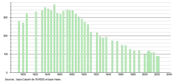 L'évolution du nombre d'habitants est connue à travers les recensements de la population effectués dans la commune depuis 1793. Pour les communes de moins de 10 000 habitants, une enquête de recensement portant sur toute la population est réalisée tous les cinq ans, les populations de référence des années intermédiaires étant quant à elles estimées par interpolation ou extrapolation[18]. Pour la commune, le premier recensement exhaustif entrant dans le cadre du nouveau dispositif a été réalisé en 2004[19].