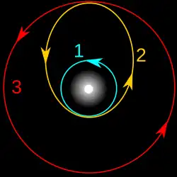 - ↑ Les périodes et vitesses orbitales sont calculées à partir des relations 4π2R3 = T2GM et V2R = GM, où : R est le rayon de l'orbite en mètres ; T est la période orbitale en secondes ; V est la vitesse orbitale en m/s ; G est la constante gravitationnelle, environ 6,673 × 10−11 Nm2/kg2 ; M est la masse terrestre de la Terre, environ 5,98×1024 kg (1,318×1025 lb).