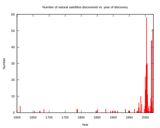 En dehors de la Lune[a] probablement connue dès la Préhistoire, la première découverte d'un satellite revient à Galilée qui, en 1610, a observé quatre satellites orbitant autour de Jupiter ; on les appelle aujourd'hui les satellites galiléens. Au cours des trois siècles suivants, peu de satellites sont découverts. Des missions spatiales vers d'autres planètes dans les années 1970, notamment avec Voyager 1 et 2, ont amorcé l'augmentation du nombre de détections. Les observations depuis l'an 2000, principalement au moyen de grands télescopes optiques terrestres, ont permis la mise en évidence de nombreux autres satellites, dont tous sont de forme irrégulière.