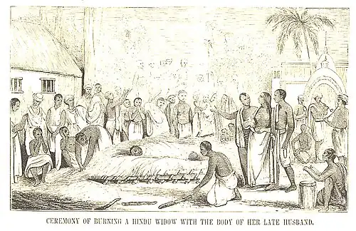 La sati, parfois appelée le sutty au XIXe siècle[4], est donc aussi le nom du sacrifice des veuves qui se jettent dans le bûcher crématoire de leur époux[5].