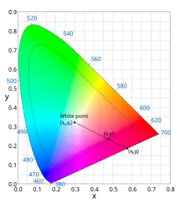 On montre facilement que la couleur métamère correspondant au mélange de deux lumières se trouve, dans le diagramme, sur la droite entre les deux points correspondant à ces lumières. Par conséquent, le point correspondant à une lumière se trouve sur la ligne entre le point de blanc, déterminé par la position de l'illuminant (conventionnel) et le point de la courbe extérieure correspondant à sa longueur d'onde dominante.
