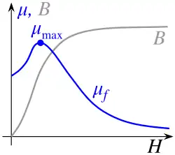 La relation entre le champ magnétisant H et le champ magnétique B peut également être exprimée par la perméabilité magnétique ou par la perméabilité relative , où est la perméabilité du vide. La perméabilité des matériaux ferromagnétiques n’est pas constante, mais dépend de H. Dans les matériaux saturables, la perméabilité relative augmente avec H jusqu’à un maximum, puis à mesure qu’elle approche de la saturation, elle décroît et tend vers un[2],[3].