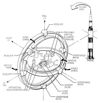 - Trois gyroscopes à un seul degré de liberté, ayant chacun leur axe d'entrée aligné avec l'un des trois axes cités précédemment[31]. Trois générateurs de signaux, fixés sur l'axe de sortie de chacun des gyroscopes, produisait des signaux électriques proportionnels aux perturbations de couple subies par l'unité (donc par déduction de la fusée tout entière). Les signaux étaient transmis à travers les composants électroniques vers les servomoteurs installés dans les pivots des gyroscopes (Servotorque Motors), pour en « rattraper » la position initiale. La boucle fermée ainsi créée[31] (Servoloop) était telle qu'elle devait maintenir le gyroscope parfaitement immobile dans son référentiel inertiel, même si la fusée « bougeait autour », en prenant divers angles d'évolution entre le décollage et l'arrivée en orbite[28] ;