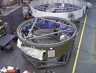 - Deux prismes, l'un fixe (Fixed Prism) et l'autre entraîné par des servomoteurs (Servo-Actuated Prism), qui fonctionnaient dans l'infrarouge et étaient utilisés avec un théodolite externe par le biais d'une petite fenêtre d'observation installée à l'extérieur de l'emplacement no 21, afin de régler l'azimut du cardan central avant le lancement[28],[30]. L'azimut pouvait être réglé avec une précision de ±5 secondes d'arc ;