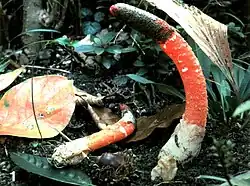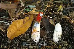 - Mutinus caninus est "capité" par une courte "tête" adhérente, nettement délimitée par un renflement et une dépression en forme d'amande, contrastant aussi par sa couleur rouge orangé sous la gléba[13],[14]. Odeur faible, de tabac et des basides 6-spores.