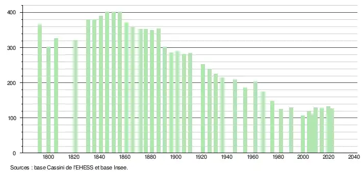 L'évolution du nombre d'habitants est connue à travers les recensements de la population effectués dans la commune depuis 1793. Pour les communes de moins de 10 000 habitants, une enquête de recensement portant sur toute la population est réalisée tous les cinq ans, les populations de référence des années intermédiaires étant quant à elles estimées par interpolation ou extrapolation[42]. Pour la commune, le premier recensement exhaustif entrant dans le cadre du nouveau dispositif a été réalisé en 2004[43].
