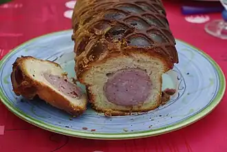 | Mets similaires | Charcuterie pâtissière, saucisson chaud, pâté en croûte, pâté lorrain, tourte, bœuf Wellington... |