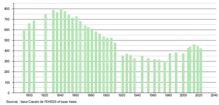 L'évolution du nombre d'habitants est connue à travers les recensements de la population effectués dans la commune depuis 1793. Pour les communes de moins de 10 000 habitants, une enquête de recensement portant sur toute la population est réalisée tous les cinq ans, les populations de référence des années intermédiaires étant quant à elles estimées par interpolation ou extrapolation[25]. Pour la commune, le premier recensement exhaustif entrant dans le cadre du nouveau dispositif a été réalisé en 2008[26].
