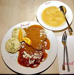 La viande est servie avec des pâtes, des Knödel, des pommes de terre et/ou du chou rouge aux pommes.