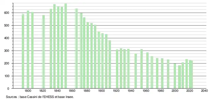 L'évolution du nombre d'habitants est connue à travers les recensements de la population effectués dans la commune depuis 1793. Pour les communes de moins de 10 000 habitants, une enquête de recensement portant sur toute la population est réalisée tous les cinq ans, les populations de référence des années intermédiaires étant quant à elles estimées par interpolation ou extrapolation[19]. Pour la commune, le premier recensement exhaustif entrant dans le cadre du nouveau dispositif a été réalisé en 2005[20].