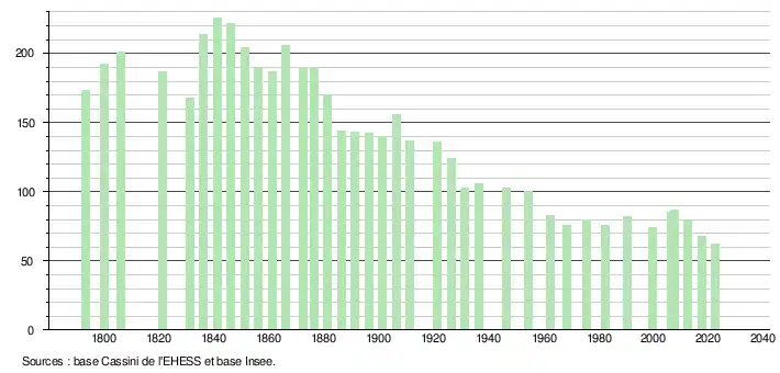 L'évolution du nombre d'habitants est connue à travers les recensements de la population effectués dans la commune depuis 1793. Pour les communes de moins de 10 000 habitants, une enquête de recensement portant sur toute la population est réalisée tous les cinq ans, les populations de référence des années intermédiaires étant quant à elles estimées par interpolation ou extrapolation[16]. Pour la commune, le premier recensement exhaustif entrant dans le cadre du nouveau dispositif a été réalisé en 2007[17].
