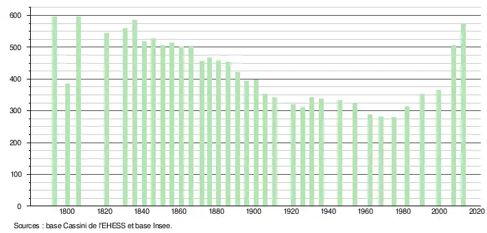 - ↑ Par convention dans Wikipédia, le principe a été retenu de n’afficher dans le tableau des recensements et le graphique, pour les populations légales postérieures à 1999, que les populations correspondant à une enquête exhaustive de recensement pour les communes de moins de 10 000 habitants, et que les populations des années 2006, 2011, 2016, etc. pour les communes de plus de 10 000 habitants, ainsi que la dernière population légale publiée par l’Insee pour l'ensemble des communes.