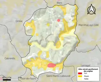 Le retrait-gonflement des sols argileux est susceptible d'engendrer des dommages importants aux bâtiments en cas d’alternance de périodes de sécheresse et de pluie. 23,2 % de la superficie communale est en aléa moyen ou fort (67,7 % au niveau départemental et 48,5 % au niveau national). Sur les 141 bâtiments dénombrés sur la commune en 2019, 56 sont en aléa moyen ou fort, soit 40 %, à comparer aux 72 % au niveau départemental et 54 % au niveau national. Une cartographie de l'exposition du territoire national au retrait gonflement des sols argileux est disponible sur le site du BRGM[33],[Carte 2].