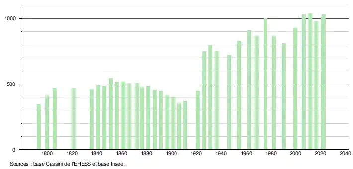 L'évolution du nombre d'habitants est connue à travers les recensements de la population effectués dans la commune depuis 1793. Pour les communes de moins de 10 000 habitants, une enquête de recensement portant sur toute la population est réalisée tous les cinq ans, les populations de référence des années intermédiaires étant quant à elles estimées par interpolation ou extrapolation[13]. Pour la commune, le premier recensement exhaustif entrant dans le cadre du nouveau dispositif a été réalisé en 2006[14].