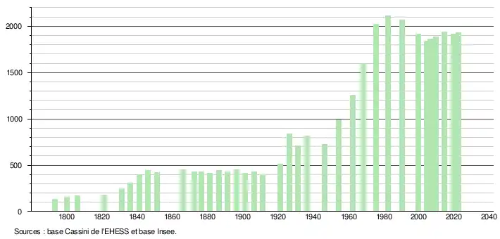 L'évolution du nombre d'habitants est connue à travers les recensements de la population effectués dans la commune depuis 1793. Pour les communes de moins de 10 000 habitants, une enquête de recensement portant sur toute la population est réalisée tous les cinq ans, les populations de référence des années intermédiaires étant quant à elles estimées par interpolation ou extrapolation[22]. Pour la commune, le premier recensement exhaustif entrant dans le cadre du nouveau dispositif a été réalisé en 2004[23].
