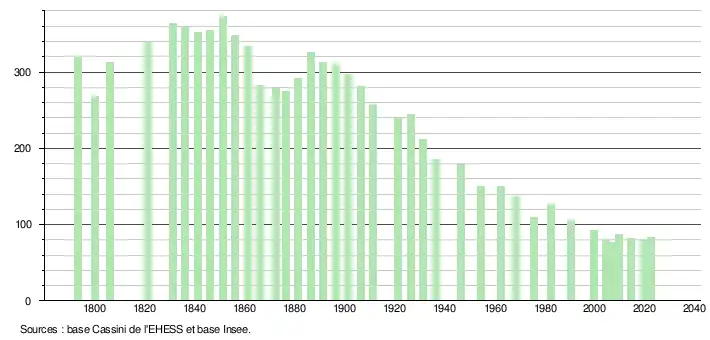 L'évolution du nombre d'habitants est connue à travers les recensements de la population effectués dans la commune depuis 1793. Pour les communes de moins de 10 000 habitants, une enquête de recensement portant sur toute la population est réalisée tous les cinq ans, les populations de référence des années intermédiaires étant quant à elles estimées par interpolation ou extrapolation[16]. Pour la commune, le premier recensement exhaustif entrant dans le cadre du nouveau dispositif a été réalisé en 2004[17].
