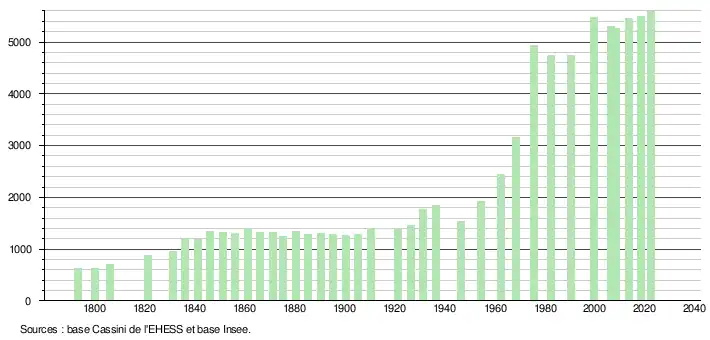 L'évolution du nombre d'habitants est connue à travers les recensements de la population effectués dans la commune depuis 1793. Pour les communes de moins de 10 000 habitants, une enquête de recensement portant sur toute la population est réalisée tous les cinq ans, les populations de référence des années intermédiaires étant quant à elles estimées par interpolation ou extrapolation[32]. Pour la commune, le premier recensement exhaustif entrant dans le cadre du nouveau dispositif a été réalisé en 2008[33].
