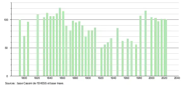 L'évolution du nombre d'habitants est connue à travers les recensements de la population effectués dans la commune depuis 1793. Pour les communes de moins de 10 000 habitants, une enquête de recensement portant sur toute la population est réalisée tous les cinq ans, les populations de référence des années intermédiaires étant quant à elles estimées par interpolation ou extrapolation[15]. Pour la commune, le premier recensement exhaustif entrant dans le cadre du nouveau dispositif a été réalisé en 2005[16].
