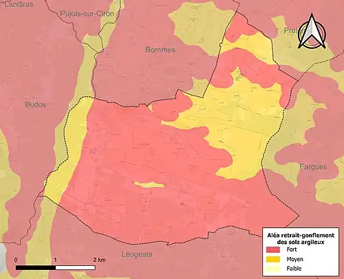 Le retrait-gonflement des sols argileux est susceptible d'engendrer des dommages importants aux bâtiments en cas d’alternance de périodes de sécheresse et de pluie. La totalité de la commune est en aléa moyen ou fort (67,4 % au niveau départemental et 48,5 % au niveau national). Sur les 387 bâtiments dénombrés sur la commune en 2019, 387 sont en aléa moyen ou fort, soit 100 %, à comparer aux 84 % au niveau départemental et 54 % au niveau national. Une cartographie de l'exposition du territoire national au retrait gonflement des sols argileux est disponible sur le site du BRGM[22],[Carte 2].