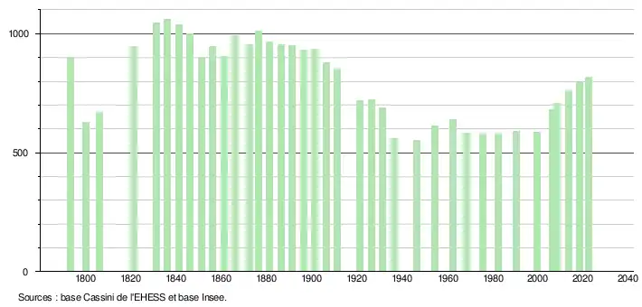 L'évolution du nombre d'habitants est connue à travers les recensements de la population effectués dans la commune depuis 1793. Pour les communes de moins de 10 000 habitants, une enquête de recensement portant sur toute la population est réalisée tous les cinq ans, les populations de référence des années intermédiaires étant quant à elles estimées par interpolation ou extrapolation[28]. Pour la commune, le premier recensement exhaustif entrant dans le cadre du nouveau dispositif a été réalisé en 2008[29].