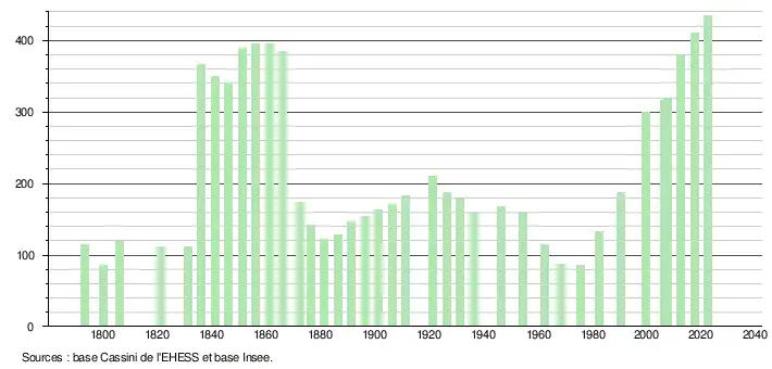 L'évolution du nombre d'habitants est connue à travers les recensements de la population effectués dans la commune depuis 1793. Pour les communes de moins de 10 000 habitants, une enquête de recensement portant sur toute la population est réalisée tous les cinq ans, les populations de référence des années intermédiaires étant quant à elles estimées par interpolation ou extrapolation[19]. Pour la commune, le premier recensement exhaustif entrant dans le cadre du nouveau dispositif a été réalisé en 2007[20].