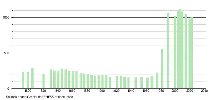 L'évolution du nombre d'habitants est connue à travers les recensements de la population effectués dans la commune depuis 1793. Pour les communes de moins de 10 000 habitants, une enquête de recensement portant sur toute la population est réalisée tous les cinq ans, les populations de référence des années intermédiaires étant quant à elles estimées par interpolation ou extrapolation[16]. Pour la commune, le premier recensement exhaustif entrant dans le cadre du nouveau dispositif a été réalisé en 2004[17].
