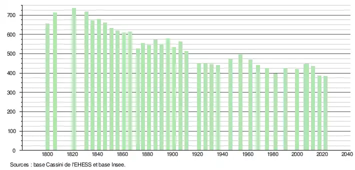 L'évolution du nombre d'habitants est connue à travers les recensements de la population effectués dans la commune depuis 1800. Pour les communes de moins de 10 000 habitants, une enquête de recensement portant sur toute la population est réalisée tous les cinq ans, les populations de référence des années intermédiaires étant quant à elles estimées par interpolation ou extrapolation[28]. Pour la commune, le premier recensement exhaustif entrant dans le cadre du nouveau dispositif a été réalisé en 2007[29].