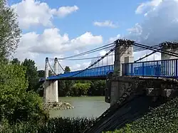 - Le pont suspendu : Le pont suspendu de Sauveterre-Saint-Denis a été construit en 1845. Franchissant la Garonne via la D 308, il est situé en amont d'Agen entre le pont de Layrac (D 17) et le pont de Saint-Nicolas - Saint-Romain (D 114). Cet ouvrage est constitué de deux travées indépendantes de 98,70 m de portée chacune, une pile en rivière, une chaussée de 2,35 m de largeur, deux trottoirs de 1,15 m. Le tout est fait en platelage bois et l'ouvrage est limité à 3,5 tonnes et à 2,90 m en hauteur. D' à , le pont a fait l'objet d'une réfection à neuf. Ainsi rénové, il a été inauguré le [34].