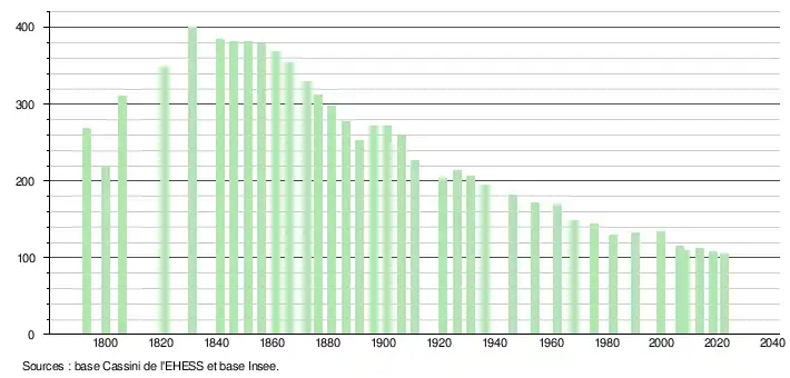 | L'évolution du nombre d'habitants est connue à travers les recensements de la population effectués dans la commune depuis 1793. Pour les communes de moins de 10 000 habitants, une enquête de recensement portant sur toute la population est réalisée tous les cinq ans, les populations de référence des années intermédiaires étant quant à elles estimées par interpolation ou extrapolation[26]. Pour la commune, le premier recensement exhaustif entrant dans le cadre du nouveau dispositif a été réalisé en 2008[27]. En 2022, la commune comptait 105 habitants[Note 4], en évolution de −3,67 % par rapport à 2016 (Gers : +1,04 %, France hors Mayotte : +2,11 %). |