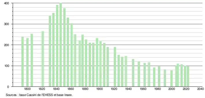 L'évolution du nombre d'habitants est connue à travers les recensements de la population effectués dans la commune depuis 1793. Pour les communes de moins de 10 000 habitants, une enquête de recensement portant sur toute la population est réalisée tous les cinq ans, les populations de référence des années intermédiaires étant quant à elles estimées par interpolation ou extrapolation[19]. Pour la commune, le premier recensement exhaustif entrant dans le cadre du nouveau dispositif a été réalisé en 2008[20].