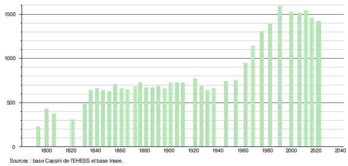 L'évolution du nombre d'habitants est connue à travers les recensements de la population effectués dans la commune depuis 1793. Pour les communes de moins de 10 000 habitants, une enquête de recensement portant sur toute la population est réalisée tous les cinq ans, les populations de référence des années intermédiaires étant quant à elles estimées par interpolation ou extrapolation[13]. Pour la commune, le premier recensement exhaustif entrant dans le cadre du nouveau dispositif a été réalisé en 2006[14].