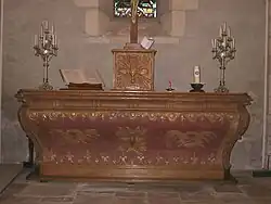 Un maître-autel du XVIIIe, en bois peint, est orné de motifs sculptés rehaussés de dorures. Au centre, une colombe figure le Saint Esprit. Il reste en usage jusqu’aux modifications liturgiques de Vatican II. Le socle d’une ancienne croix sert maintenant d’autel plus petit et plus sobre au pied du chœur, face aux fidèles.