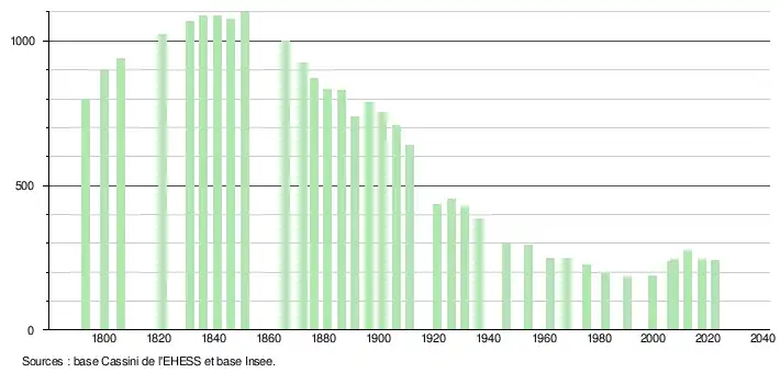 L'évolution du nombre d'habitants est connue à travers les recensements de la population effectués dans la commune depuis 1793. Pour les communes de moins de 10 000 habitants, une enquête de recensement portant sur toute la population est réalisée tous les cinq ans, les populations de référence des années intermédiaires étant quant à elles estimées par interpolation ou extrapolation[24]. Pour la commune, le premier recensement exhaustif entrant dans le cadre du nouveau dispositif a été réalisé en 2007[25].