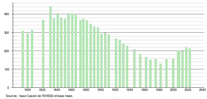 L'évolution du nombre d'habitants est connue à travers les recensements de la population effectués dans la commune depuis 1793. Pour les communes de moins de 10 000 habitants, une enquête de recensement portant sur toute la population est réalisée tous les cinq ans, les populations de référence des années intermédiaires étant quant à elles estimées par interpolation ou extrapolation[28]. Pour la commune, le premier recensement exhaustif entrant dans le cadre du nouveau dispositif a été réalisé en 2007[29].