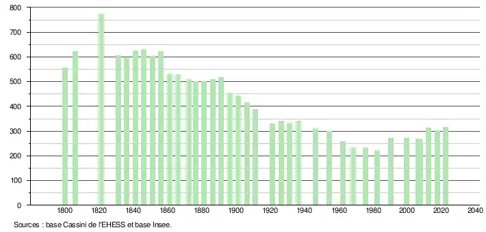 L'évolution du nombre d'habitants est connue à travers les recensements de la population effectués dans la commune depuis 1800. Pour les communes de moins de 10 000 habitants, une enquête de recensement portant sur toute la population est réalisée tous les cinq ans, les populations de référence des années intermédiaires étant quant à elles estimées par interpolation ou extrapolation[21]. Pour la commune, le premier recensement exhaustif entrant dans le cadre du nouveau dispositif a été réalisé en 2007[22].