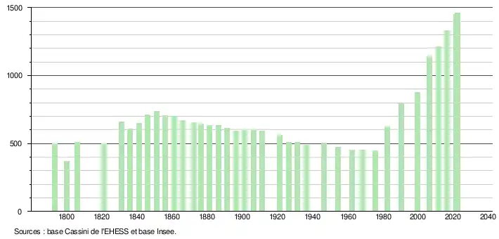 L'évolution du nombre d'habitants est connue à travers les recensements de la population effectués dans la commune depuis 1793. Pour les communes de moins de 10 000 habitants, une enquête de recensement portant sur toute la population est réalisée tous les cinq ans, les populations de référence des années intermédiaires étant quant à elles estimées par interpolation ou extrapolation[22]. Pour la commune, le premier recensement exhaustif entrant dans le cadre du nouveau dispositif a été réalisé en 2006[23].