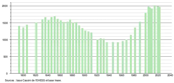 L'évolution du nombre d'habitants est connue à travers les recensements de la population effectués dans la commune depuis 1793. Pour les communes de moins de 10 000 habitants, une enquête de recensement portant sur toute la population est réalisée tous les cinq ans, les populations de référence des années intermédiaires étant quant à elles estimées par interpolation ou extrapolation[15]. Pour la commune, le premier recensement exhaustif entrant dans le cadre du nouveau dispositif a été réalisé en 2004[16].
