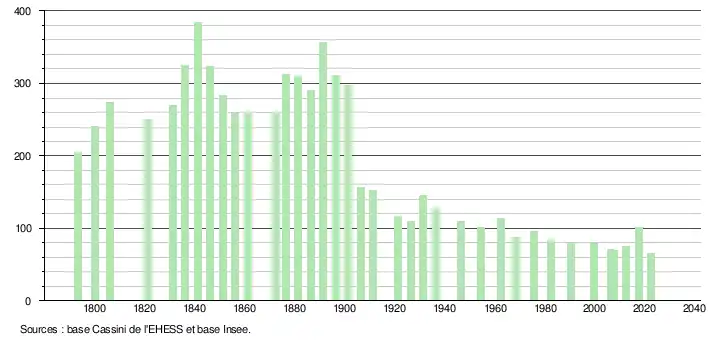 L'évolution du nombre d'habitants est connue à travers les recensements de la population effectués dans la commune depuis 1793. Pour les communes de moins de 10 000 habitants, une enquête de recensement portant sur toute la population est réalisée tous les cinq ans, les populations de référence des années intermédiaires étant quant à elles estimées par interpolation ou extrapolation[24]. Pour la commune, le premier recensement exhaustif entrant dans le cadre du nouveau dispositif a été réalisé en 2007[25].