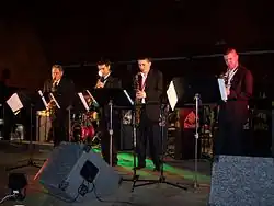 Trois saxophones de différentes tailles (de gauche à droite) : alto, soprano (courbé) et ténor | |