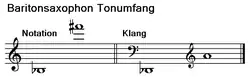 Comme les autres saxophones, le saxophone baryton est un instrument transpositeur. Il sonne une octave en dessous du saxophone alto, en mi : le son entendu est une treizième (une octave plus une sixte majeure) en dessous de la note jouée. Historiquement, son registre (notes jouées et non entendues) commençait au si grave (sous la portée de clé de sol), mais le corps a été rallongé pour obtenir une note grave supplémentaire, le la grave; les deux modèles sont donc disponibles. Sur les deux photos à droite, on voit que l'ancien Conn a un pavillon plus court tandis que le pavillon du Selmer plus récent remonte plus haut et possède une quatrième clé pour obtenir le la grave. Dans les aigües, il va jusqu'au fa♯ (au-dessus de la même portée). Toutefois, le baryton permet de jouer des notes dans le suraigu, comme les autres saxophones. Le saxophone baryton se distingue des autres saxophones par son corps supérieur qui comporte une boucle, permettant à l'instrument de conserver une taille raisonnable. Une autre particularité est le doigté qui comporte une clé supplémentaire permettant d'atteindre le la grave, correspondant au do grave du violoncelle (les autres instruments descendant au si).
