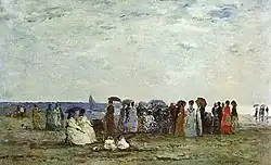 La gare de Trouville ouvre en 1863. Vêtus de crinolines impeccables et de hauts-de-forme formels, les riches touristes des compositions de Boudin illustrent la bourgeoisie nouvellement enrichie qui afflue vers la côte depuis Paris[3]. Dans La Plage, près de Trouville, en 1865, conservée au Musée Artizon à Tokyo, l’homme debout au centre du groupe de gauche, coiffé d'un chapeau melon, est le baron de Rothschild et la femme assise en blanc, avec une ombrelle, est l'Impératrice Eugénie[4]. Dans La Princesse Pauline Metternich sur la plage, réalisé vers 1865-1867, Boudin représente Pauline Metternich, épouse de l'ambassadeur d'Autriche à la cour de Napoléon III, célèbre icône de style simple mais chic. A part l'impératrice Eugénie, aucune femme n'aurait suscité plus d'intérêt sur la plage que son amie la princesse Metternich[5].
