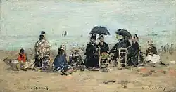 ![]() | Scène de genre | La Conversation sur la plage de Trouville | 1876 | huile sur acajou | 12,3 × 25 cm | musée Eugène-Boudin de Honfleur | Notice Joconde consulté le 22/03/2022 |