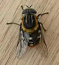 Scaptia auriflua mesure environ 10 mm. Sa couleur et la présence de poils la font ressembler à une abeille.