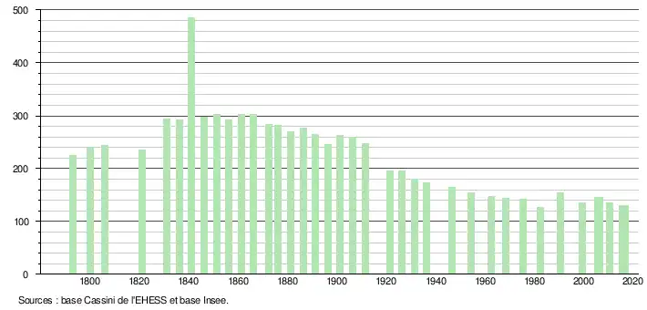 L'évolution du nombre d'habitants est connue à travers les recensements de la population effectués dans la commune depuis 1793. Pour les communes de moins de 10 000 habitants, une enquête de recensement portant sur toute la population est réalisée tous les cinq ans, les populations de référence des années intermédiaires étant quant à elles estimées par interpolation ou extrapolation[4]. Pour la commune, le premier recensement exhaustif entrant dans le cadre du nouveau dispositif a été réalisé en 2005[5].